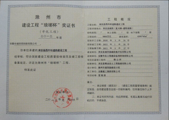 滁州市建設(shè)工程“瑯琊杯”獎
